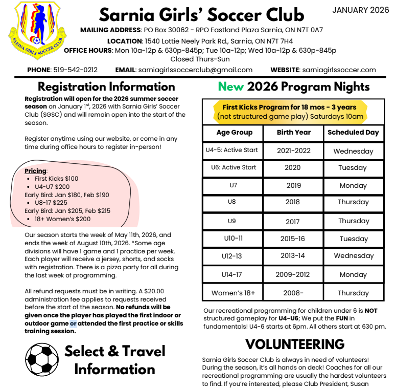 The Sarnia Girls Soccer' Club is the longest continuously operating All-Female soccer organization in the City of Sarnia. The club was founded in 1974 as a non-profit by a group of volunteers and parents looking to broaden opportunities for young females through the practice of soccer while at the same time assisting them in the development of the skills necessary to succeed in life.